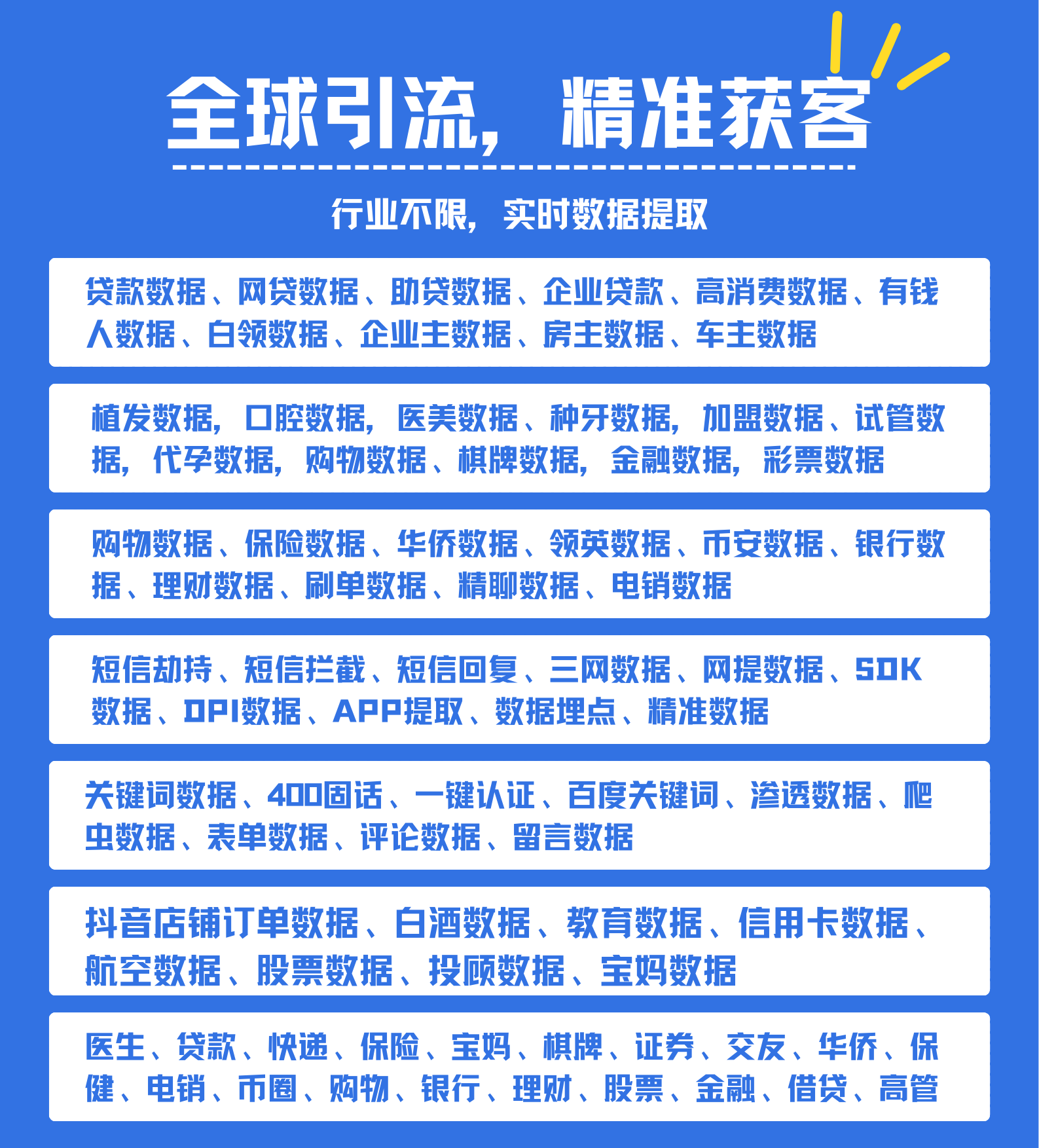 涵盖所有行业客户数据,包括贷款、金融、股票、教育、物流、电商、美容、白酒、保健、保险……等热门行业